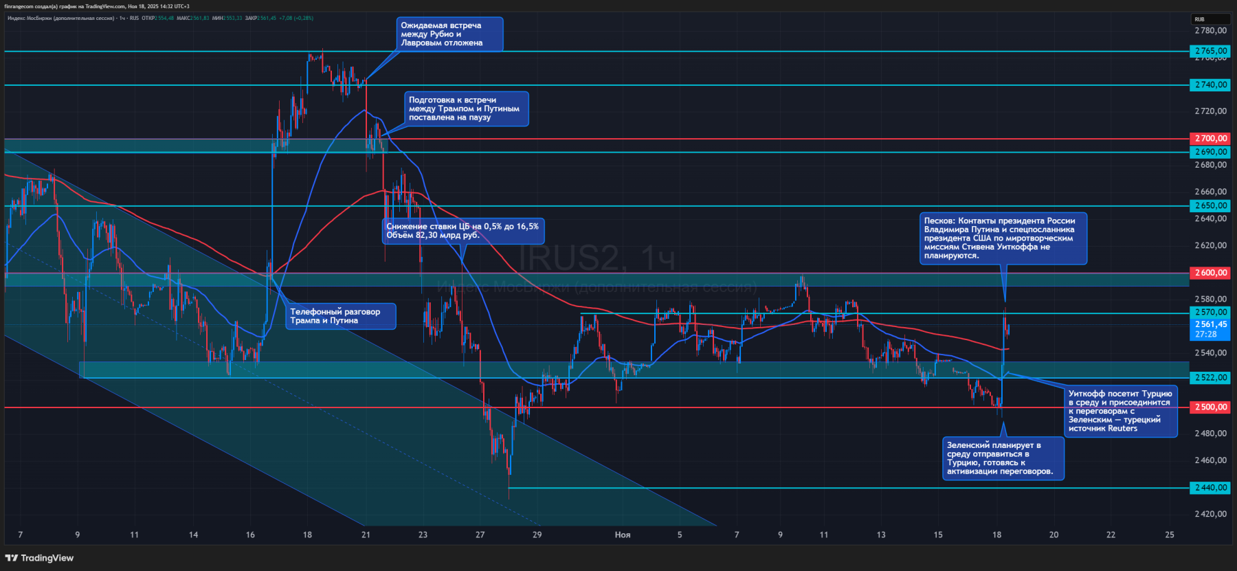 После, в Кремле заявили об отсутствии планов по контактам президента с Уиткоффом и присутствии России на переговорах в Турции. На этом началась фиксация на российском рынке, но ниже уже не пошли. Видимо участники рынка, опасаясь пропустить "тот самый разворот" уже не готовы продавать акции по текущим ценам и ждут официальных заявлений Уиткоффом или Трампа после завтрашней встречи в Турции.