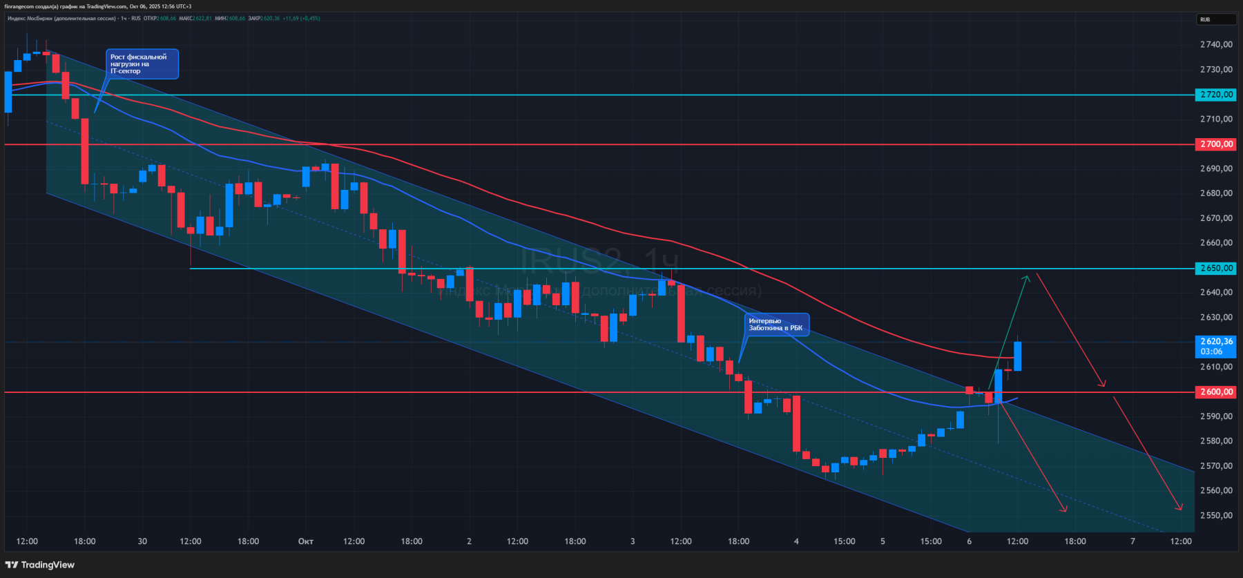 Поддержку рынку сегодня оказывает отскок нефтяных котировок и других цен на сырьевые товары с одновременным ослаблением рубля. Индекс МосБиржи пробил на часовом графике среднесрочный нисходящий тренд и скользящую 50ЕМА. Тем не менее, пока мы не пробьем и закрепимся выше 2650 пунктов – тренд нисходящий. Мы можем уйти в боковик 2600-2650 пунктов. Далее, если не появится драйверов для роста, сползли ниже.