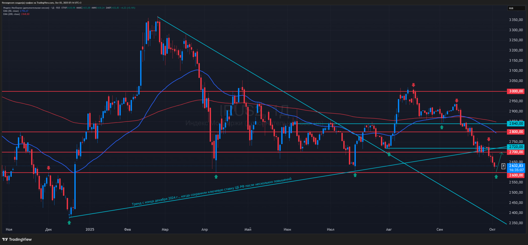 Если смотреть на главные акции по весу в индексе, то Сбер, Газпром, Лукойл, Татнефть и Т-Банк сегодня пробили свои ключевые уровни поддержек. Поэтому есть вероятность того, что мы увидим сегодня 2600 пунктов. Для разворота нужны серьёзные основания. При этом, впереди сезон отчетностей за III кв. 2025 г., которые будут слабые. Поэтому логичнее в понедельник на дивгэпах уйти ниже уровня 2600 и сделать отскок к 2700 пунктов по Индексу МосБиржи.