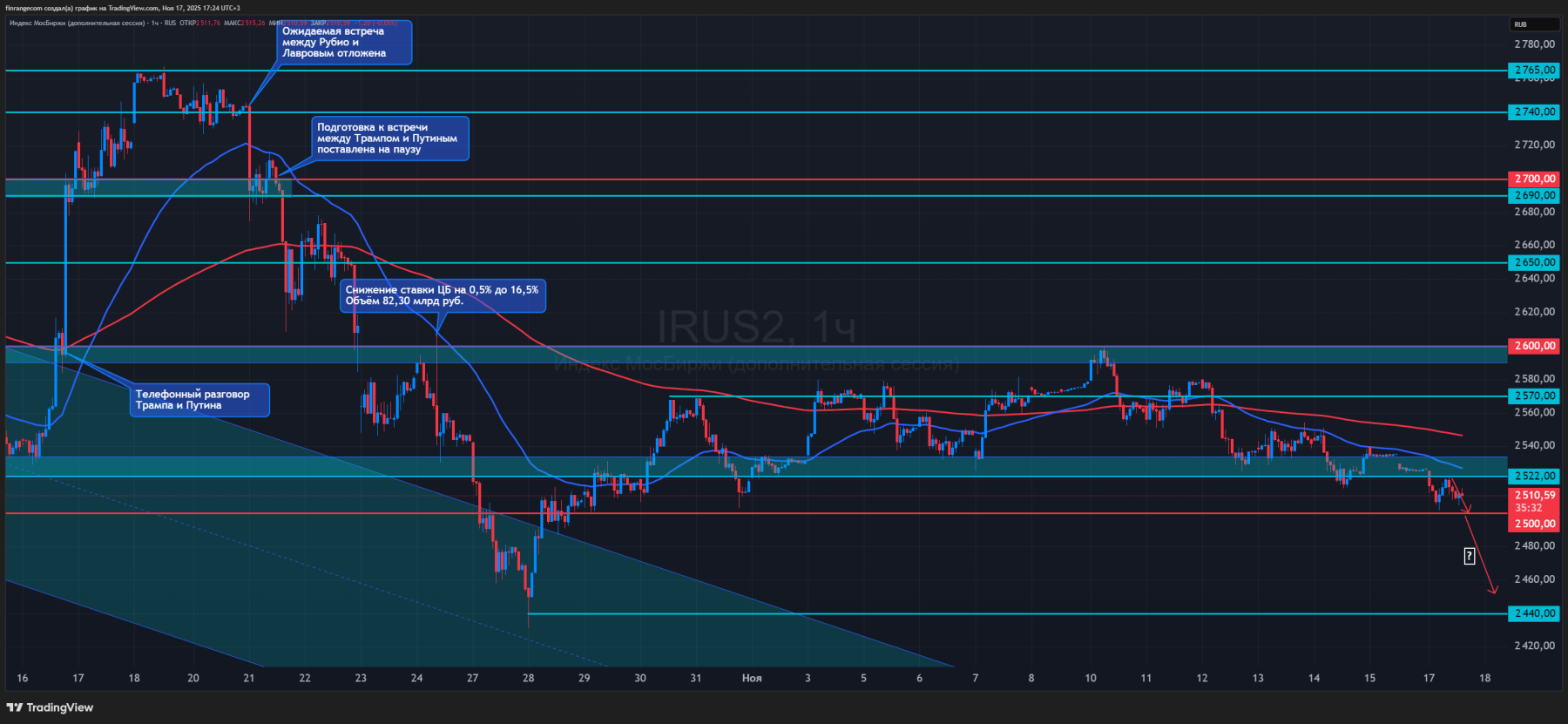 Выходные открылись в плюсе, но сразу перешли к снижению. Утром получили ещё один выход из боковика 2522-2600 пунктов после того, как Трамп заявил, что готов поддержать готовящийся в конгрессе законопроект, направленный на введение санкций против стран, которые ведут бизнес с Россией.