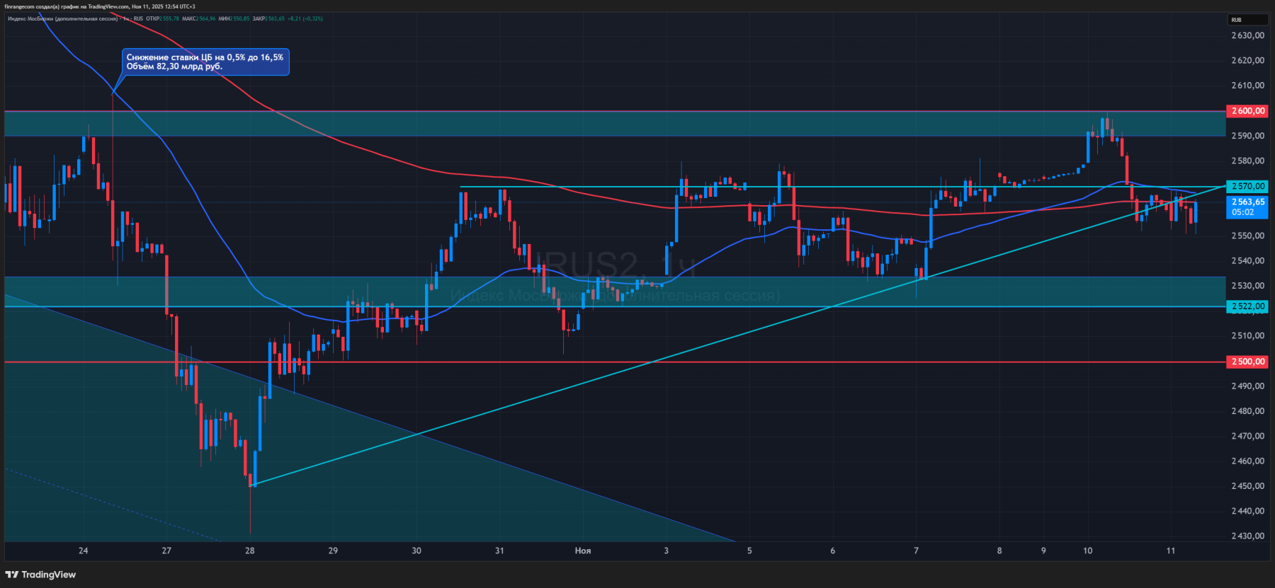 Таким образом, как и писал ранее, рост рынка в праздничные дни в отсутствии негатива и профучастников, не имел за собой основания. В итоге мы вернулись в боковик 2522–2600 пунктов. Сегодня индекс МосБиржи торгуется под локальным сопротивлением около 2570 пунктов.